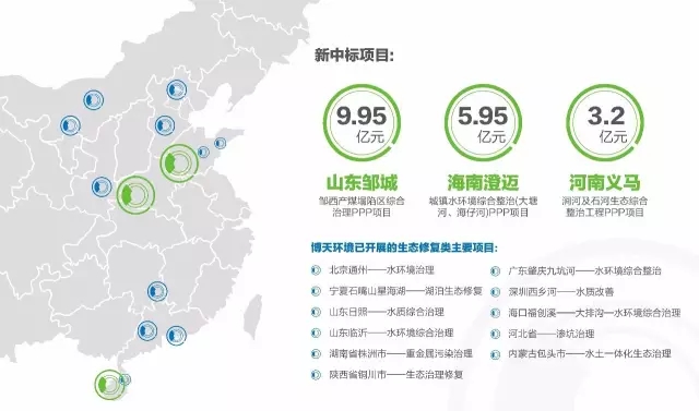 近日,博天環(huán)境集團(tuán)(603603.SH)通過(guò)聯(lián)合體合作方式分別贏取了位于山東省鄒城市、河南省義馬市和海南省澄邁縣的三個(gè)生態(tài)修復(fù)類項(xiàng)目。其中山東省鄒城市鄒西產(chǎn)煤塌陷區(qū)綜合治理PPP項(xiàng)目,投資概算約9.95億元;河南省義馬市澗河及石河生態(tài)綜合整治工程(PPP),項(xiàng)目總投資約3.2億元;海南省澄邁縣城鎮(zhèn)水環(huán)境綜合整治(大塘河、海仔河)PPP項(xiàng)目,估算總投資5.95億元。