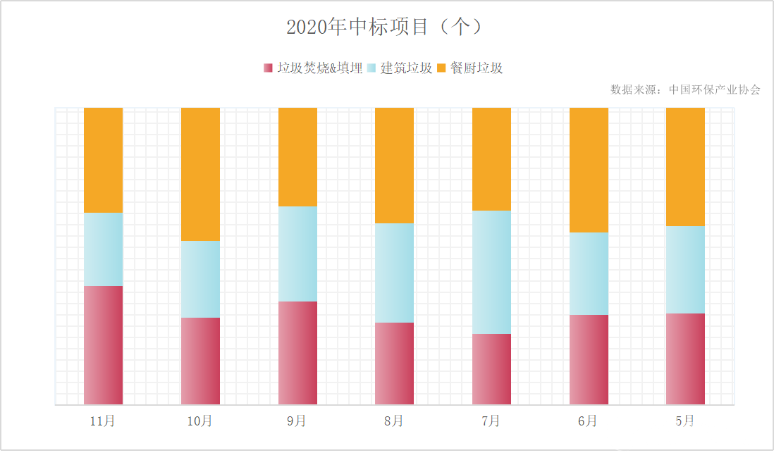 2020年前11個月,全國垃圾焚燒中標(biāo)項目共計311項,總投資金額共計655.15億元;餐廚垃圾處理處置中標(biāo)項目共計361項,總投資金額194.6億元;2020年5月到11月,全國建筑垃圾處理處置中標(biāo)項目共計213項,總投資金額61.85億元。