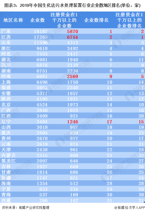 值得注意的是,排名第一的廣東省共有18187家新成立企業(yè),但是它的注冊(cè)資金在1千萬(wàn)以上的企業(yè)數(shù)(5870家)卻不如排名第二的江蘇省(6754家)。因此,可以看出雖然廣東省有18187家企業(yè)但是江蘇省(17265家)才是中國(guó)生化法污水處理裝置行業(yè)主要集中地。此外,河南省和遼寧省也是同樣的情況,雖然企業(yè)數(shù)排名較后,但是其注冊(cè)資金在1千萬(wàn)以上的企業(yè)數(shù)排名卻比新成立企業(yè)數(shù)排名較為靠前。