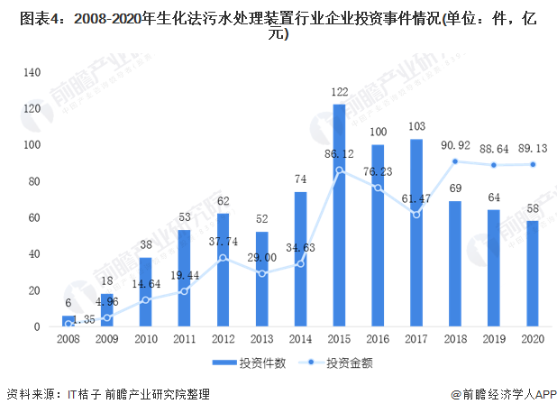 根據(jù)IT桔子的數(shù)據(jù)顯示,2008-2020年生化法污水處理裝置行業(yè)企業(yè)投資事件呈現(xiàn)波動(dòng)趨勢(shì)。在2015年,生化法污水處理裝置行業(yè)企業(yè)投資事件達(dá)到近年來(lái)峰值122件,但投資金額為86.12億元。從投資金額角度來(lái)看,在2018年,生化法污水處理裝置行業(yè)企業(yè)投資達(dá)到了近年來(lái)峰值90.92億元。