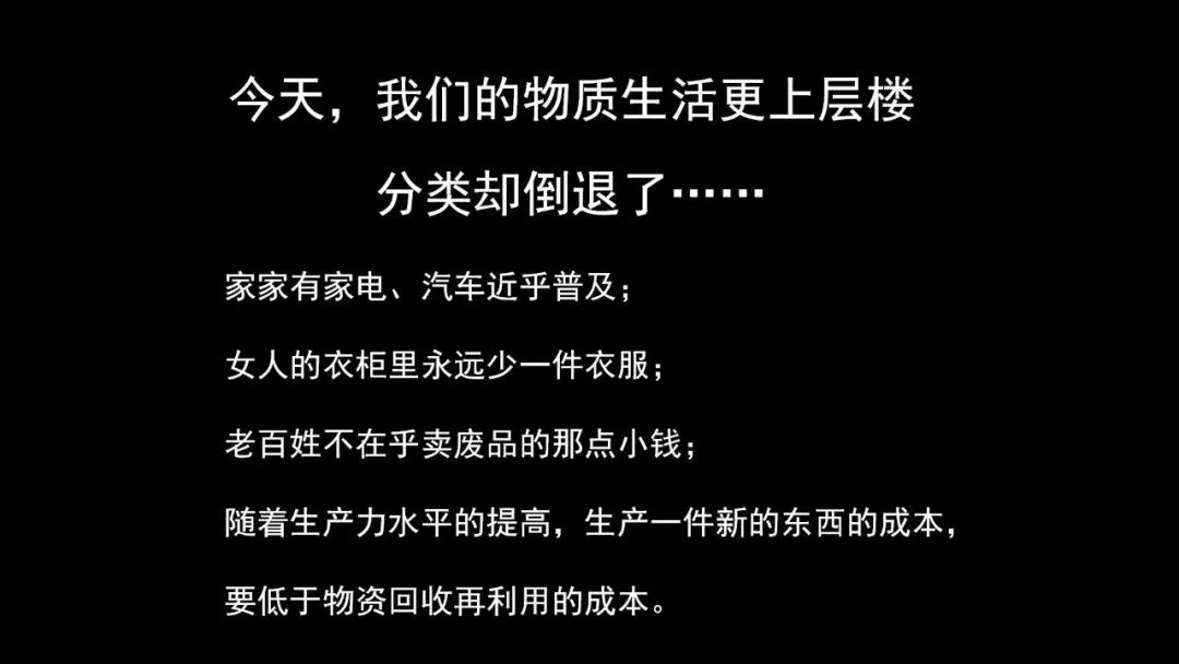 但是大家發(fā)現(xiàn)沒(méi)有到了今天,我們家里面有房、有車(chē)、有衣服、有書(shū),有各種各樣的東西充滿(mǎn)了家里面,我們垃圾分類(lèi)工作卻倒退了。