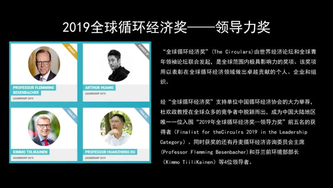 從我們國(guó)家來(lái)講,全國(guó)200多個(gè)大中城市,每年會(huì)產(chǎn)生2億多噸的垃圾,這個(gè)量非常大,如果中國(guó)的垃圾分類(lèi)工作做好了,全世界的循環(huán)經(jīng)濟(jì)的工作就做好了三分之一,所以達(dá)沃斯世界經(jīng)濟(jì)論壇設(shè)立了一個(gè)全球循環(huán)經(jīng)濟(jì)獎(jiǎng),專(zhuān)門(mén)獎(jiǎng)勵(lì)這方面的企業(yè)和領(lǐng)導(dǎo)人、專(zhuān)家,很榮幸在2019年,我作為中國(guó)大陸唯一的一個(gè)人入圍了它的領(lǐng)導(dǎo)力獎(jiǎng)。