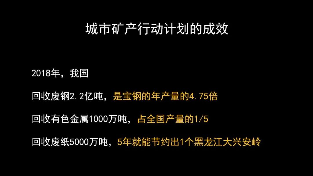 從2009年我們實(shí)施城市礦產(chǎn)行動(dòng)計(jì)劃,到2018年,有什么樣的效果呢,大家看這幾組數(shù)據(jù)就知道了。2018年,我們回收的廢鋼鐵是2.2億噸,大概相當(dāng)于中國(guó)寶鋼2018年產(chǎn)量的4.75倍;我們回收的再生有色金屬是1000萬(wàn)噸,當(dāng)年我們有色金屬產(chǎn)量是什么呢?5000萬(wàn)噸,占了全年的五分之一;2018年回收的廢紙是5000萬(wàn)噸,這5000萬(wàn)噸廢紙如果連續(xù)5年回收使用,相當(dāng)于我們一個(gè)大興安嶺的森林來(lái)解決我們用紙的問(wèn)題。