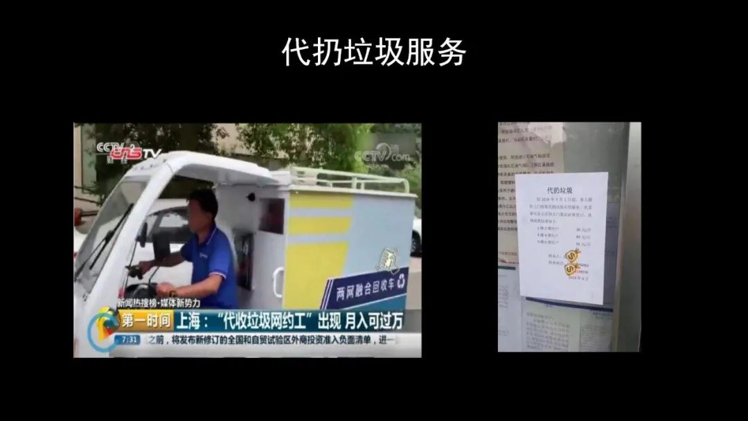上海有大量的年輕人上班 996,定時(shí)定點(diǎn)投放垃圾,到這個(gè)時(shí)間我在上班我沒(méi)辦法投,怎么辦?這也是大家提出來(lái)的問(wèn)題,所以有些年輕人就想了辦法,干脆我的垃圾請(qǐng)人代扔,我給你錢(qián),這叫代扔垃圾;