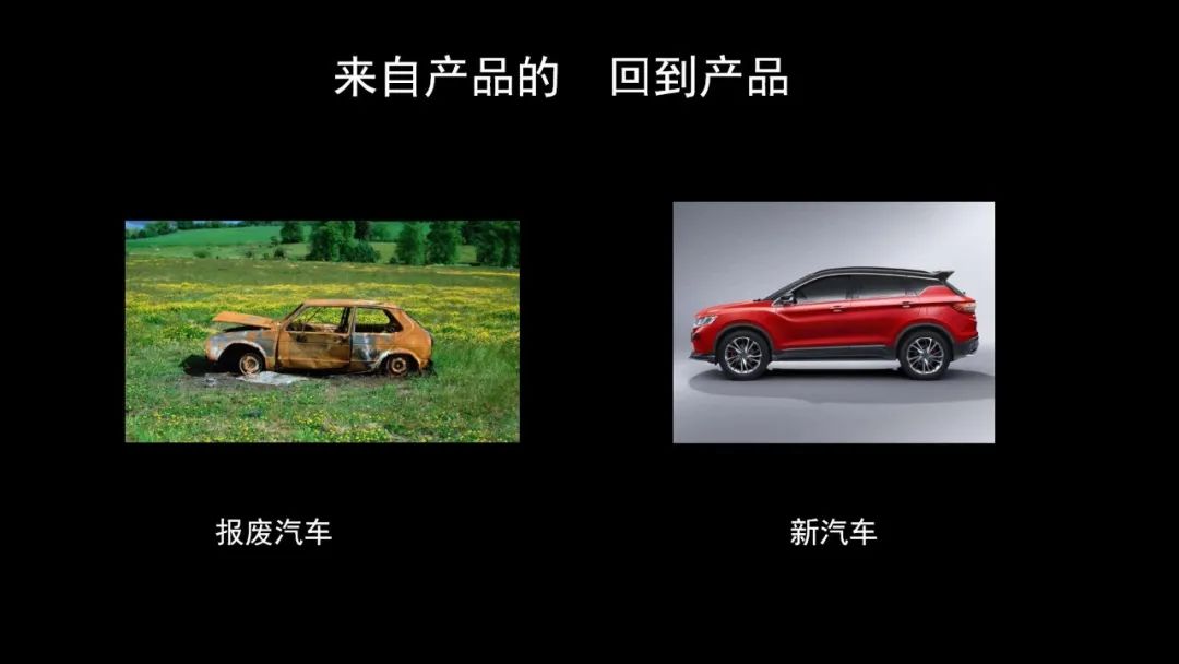 我們家報(bào)廢的舊汽車(chē),把里面的金屬,把里面的銅鋁 鐵、塑料回收,可能變成你家接下來(lái)要的新汽車(chē),我想這就是來(lái)自產(chǎn)品,回到產(chǎn)品。