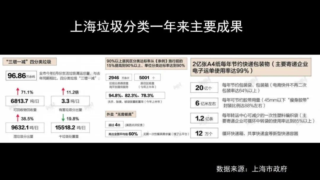 上海垃圾分類(lèi)一年下來(lái)效果怎么樣呢,我想用數(shù)字來(lái)說(shuō)話(huà)。第一,原來(lái)的垃圾分類(lèi)率是15%,到今年(2020年)的7月1日為止是90%,說(shuō)明我們中國(guó)的老百姓素質(zhì)還是比較高的,能響應(yīng)國(guó)家的號(hào)召;我們從垃圾的角度實(shí)際的效果如何呢,我們叫“三增一減”。