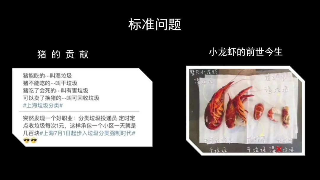 “豬能吃的叫濕垃圾,豬不能吃的叫干垃圾,豬吃了會(huì)死的叫有害垃圾,賣(mài)了能買(mǎi)豬肉吃的叫做可回收垃圾”,很形象吧,這是標(biāo)準(zhǔn)的問(wèn)題;