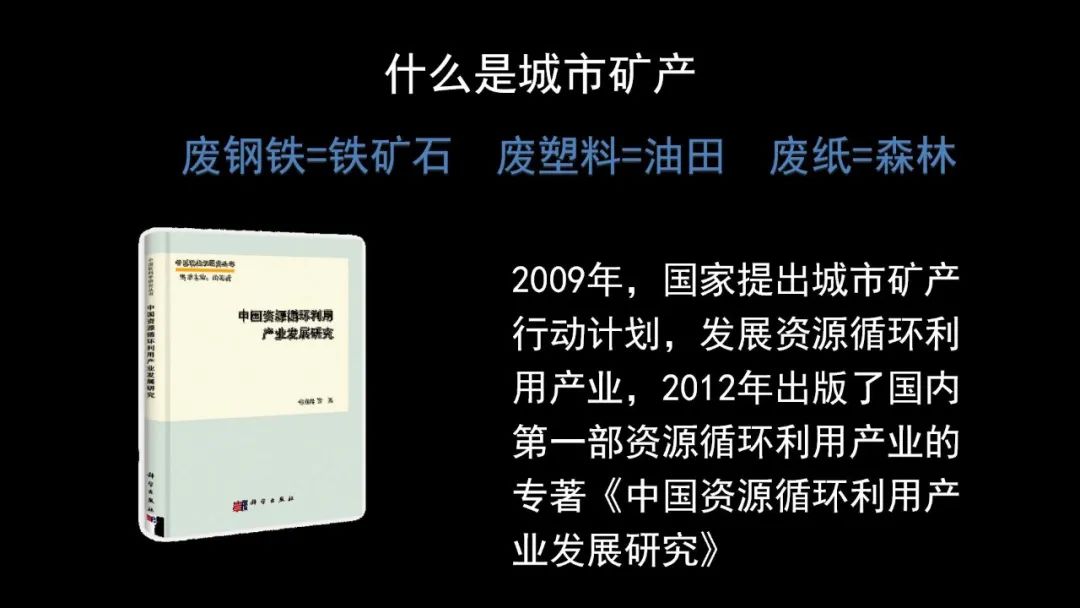 在2009年,當(dāng)時(shí)為了解決中國(guó)資源的不足的問(wèn)題,我們跟國(guó)家發(fā)改委一起,起草了一個(gè)“城市礦產(chǎn)行動(dòng)計(jì)劃”報(bào)給國(guó)務(wù)院的主要領(lǐng)導(dǎo),領(lǐng)導(dǎo)批了以后,全國(guó)建49個(gè)城市礦產(chǎn)基地,是為了解決中國(guó)消費(fèi)結(jié)束以后各類(lèi)廢棄物資源化處置的問(wèn)題。在這個(gè)基礎(chǔ)上我專(zhuān)門(mén)寫(xiě)了一本書(shū)《中國(guó)資源循環(huán)利用產(chǎn)業(yè)發(fā)展研究》。