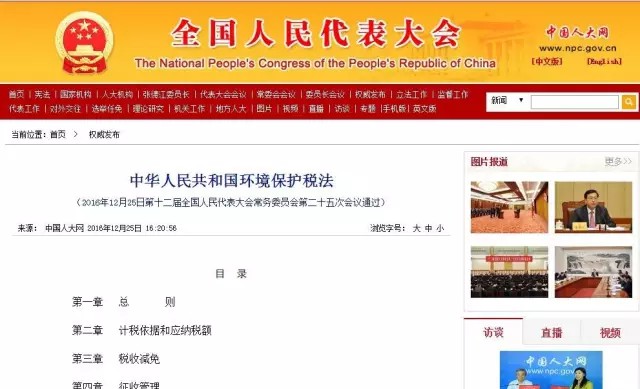 2016年12月25日,曾走過6年立法之路、歷經(jīng)兩次審議的《中華人民共和國(guó)環(huán)境保護(hù)稅法》終于由第十二屆全國(guó)人民代表大會(huì)常務(wù)委員會(huì)第二十五次會(huì)議通過。習(xí)近平簽發(fā)中華人民共和國(guó)第六十一號(hào)主席令予以公布,新法自2018年1月1日起施行。