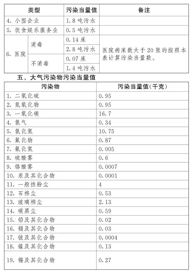 第八條 應(yīng)稅大氣污染物、水污染物的污染當(dāng)量數(shù),以該污染物的排放量除以該污染物的污染當(dāng)量值計(jì)算。每種應(yīng)稅大氣污染物、水污染物的具體污染當(dāng)量值,依照本法所附《應(yīng)稅污染物和當(dāng)量值表》執(zhí)行。