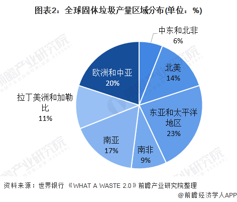 根據(jù)《WHAT A WASTE 2.0》公布的數(shù)據(jù)顯示,從全球固體垃圾產(chǎn)量區(qū)域分布來(lái)看,東亞和太平洋地區(qū)固體垃圾產(chǎn)生量最多,占全球的比重為23%,其次為歐洲和中亞地區(qū),其固體垃圾產(chǎn)生量占全球的比重為20%,南亞地區(qū)固體垃圾產(chǎn)生量占全球的比重為17%,北美地區(qū)固體垃圾產(chǎn)生量占全球的比重為14%。