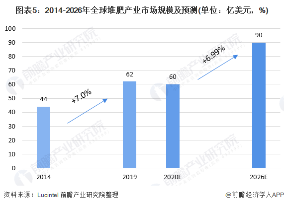 全球堆肥產(chǎn)業(yè)在農(nóng)業(yè),家庭園藝,園林綠化,園藝和建筑行業(yè)都有機(jī)遇。根據(jù)Lucintel公布的數(shù)據(jù)顯示,2019年全球堆肥產(chǎn)業(yè)市場(chǎng)規(guī)模為62億美元,由于COVID-19導(dǎo)致的全球經(jīng)濟(jì)衰退,預(yù)計(jì)全球堆肥產(chǎn)業(yè)市場(chǎng)規(guī)模將在2020年下降,2020年全球堆肥產(chǎn)業(yè)市場(chǎng)規(guī)模約為60億美元,然而,市場(chǎng)將在2021年見(jiàn)證復(fù)蘇,預(yù)計(jì)到2026年將達(dá)到90億美元,從2020年到2026年的復(fù)合年增長(zhǎng)率為5%至7%。