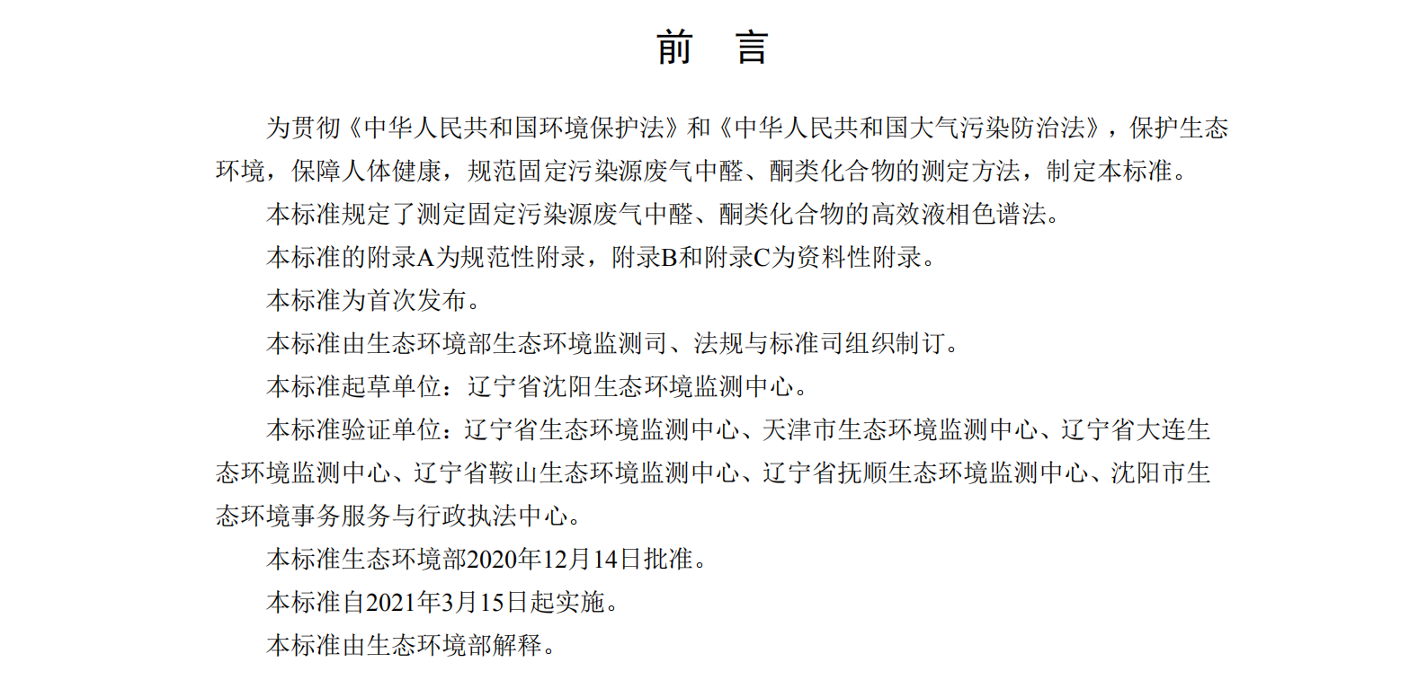 為貫徹《中華人民共和國環(huán)境保護法》和《中華人民共和國大氣污染防治法》,保護生態(tài) 環(huán)境,保障人體健康,規(guī)范固定污染源廢氣中醛、酮類化合物的測定方法,制定本標準。