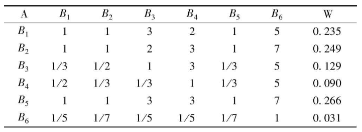 3)建立判斷矩陣。該步驟中評(píng)定層次中元素間的相對(duì)重要程度判斷,進(jìn)行兩兩比較。元素間的相對(duì)重要性的判斷值采用1~9標(biāo)度法。