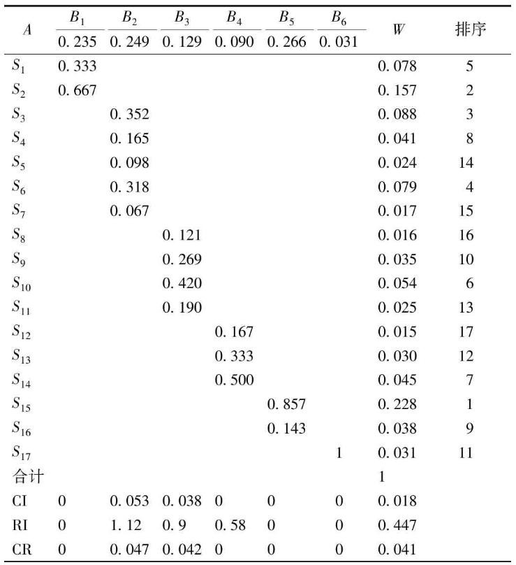 通過(guò)公式計(jì)算出:準(zhǔn)則層B對(duì)子準(zhǔn)則層S的判斷矩陣B1-S1-2、B2-S3-7、B3-S8-11、B4-S12-14、B5-S15-16、B6-S17,如表5所示??芍簩?duì)修復(fù)影響最大的是污染物類型,其權(quán)重為0.228。其次,地質(zhì)條件在修復(fù)過(guò)程中也有重要的影響,其權(quán)重為0.157。修復(fù)過(guò)程中的技術(shù)成熟度也相當(dāng)重要,其權(quán)重為0.088;修復(fù)過(guò)程中技術(shù)可實(shí)施性也存在影響,其權(quán)重為0.079;修復(fù)中的水文條件也是一個(gè)因素,其權(quán)重均為0.078;在修復(fù)過(guò)程中設(shè)備投資也有一定影響作用,其權(quán)重為0.054;修復(fù)中也要注意水資源的保護(hù),其權(quán)重為0.045;在修復(fù)中,修復(fù)周期也有影響,其權(quán)重為0.041。污染物濃度、后期管理費(fèi)用、pH、生態(tài)保護(hù)也起到一定作用,其權(quán)重分別為0.038、0.035、0.031、0.030。當(dāng)然,在修復(fù)過(guò)程也要注意運(yùn)行成本、修復(fù)效率、工人健康安全、監(jiān)測(cè)費(fèi)用、副產(chǎn)品危害等問題,其權(quán)重分別為0.025、0.024、0.017、0.016、0.015。表5 層次總排序