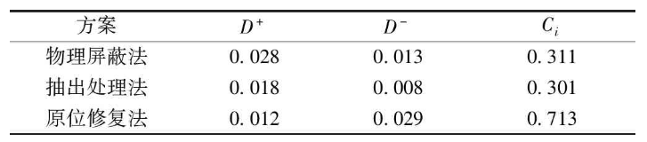 根據(jù)相對(duì)接近度確定修復(fù)方案優(yōu)劣排序,由表7可看出:相對(duì)接近度Ci(原位修復(fù)法)>Ci(物理屏蔽法)>Ci(抽出處理法),所以原位修復(fù)法在該地區(qū)更適合地下水鉛的修復(fù)。目標(biāo)層對(duì)方案層的分析優(yōu)化矩陣也表明,在技術(shù)條件中的技術(shù)成熟度、修復(fù)周期、技術(shù)可實(shí)施性、工人健康安全方面,原位修復(fù)技術(shù)比抽出處理法和物理屏蔽法更適宜。通過(guò)最后指標(biāo)權(quán)重的優(yōu)劣排序,也可以看出原位修復(fù)技術(shù)更具有優(yōu)勢(shì),比較適合該地區(qū)地下水鉛的修復(fù)。