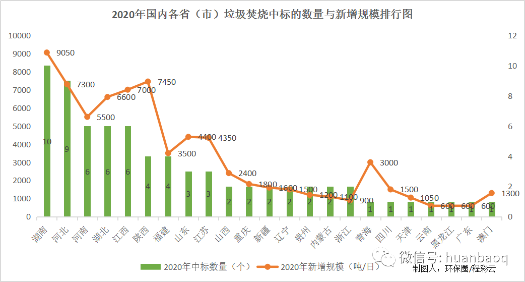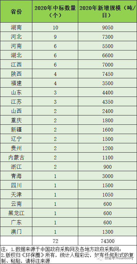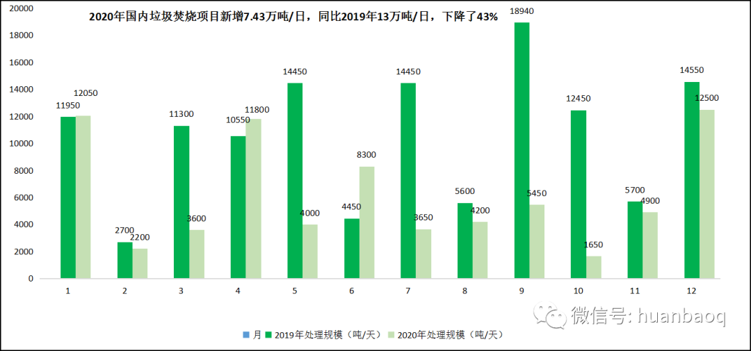 稍加留意就會(huì)發(fā)現(xiàn),相較于前兩年的大項(xiàng)目頻現(xiàn),各家企業(yè)中標(biāo)捷報(bào)頻傳,2020年類似的報(bào)道少了許多,全國(guó)釋放的垃圾焚燒項(xiàng)目罕見(jiàn)下滑,新增項(xiàng)目開(kāi)始“降溫”。這一現(xiàn)象,筆者早在去年6月就注意到了,當(dāng)時(shí)還以為是受疫情的影響,但其實(shí)大家都想錯(cuò)了。據(jù)筆者長(zhǎng)期跟蹤各省政府采購(gòu)網(wǎng)統(tǒng)計(jì)得出,2020年1月-12月,國(guó)內(nèi)新中標(biāo)的垃圾焚燒發(fā)電項(xiàng)目累計(jì)72個(gè),相比2019年新中標(biāo)120個(gè)項(xiàng)目減少48個(gè),同比下滑了40%;新增日處理規(guī)模7.43萬(wàn)噸/日,相比2019年近13萬(wàn)噸/日的新增規(guī)模,同比減少了43%;總投資373億元,相比2019年總投資600億元也減少了227億元,降幅達(dá)到37.83%。(項(xiàng)目清單詳見(jiàn)文末)看得出來(lái),2020年國(guó)內(nèi)釋放的垃圾焚燒項(xiàng)目,無(wú)論是中標(biāo)數(shù)量,還是日處理規(guī)模,亦或是總投資額,與2019年相比都有4-5成左右的下滑,下降的不是一點(diǎn)點(diǎn),而是幾乎“腰斬”。從月份來(lái)看,除了1月、4月、6月,2020年新增的日處理規(guī)模較2019年有所增長(zhǎng)外,其余每個(gè)月份都有著不同程度的下滑,少則3-6千噸/日,多則上萬(wàn)噸/日。其中,5月、7月、9月、10月四個(gè)月的下降幅度最大,均是萬(wàn)噸/日級(jí)別以上的減少。(如圖一、圖二所示)圖一:2019年VS2020年,全國(guó)釋放的垃圾焚燒項(xiàng)目規(guī)模對(duì)比圖二:2020年國(guó)內(nèi)垃圾焚燒項(xiàng)目新增7.43萬(wàn)噸/日,同比下降了43%02