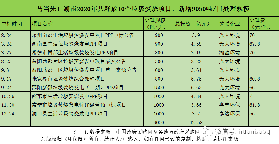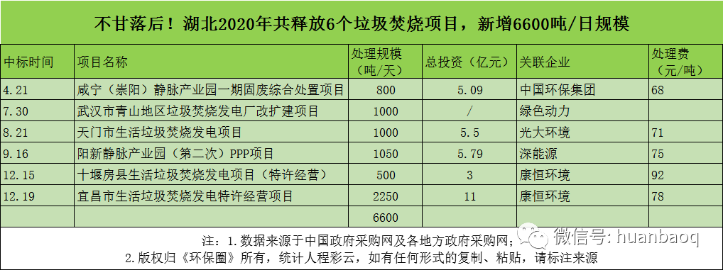 從項(xiàng)目分布的省份來(lái)看,2020年定標(biāo)的72個(gè)垃圾焚燒項(xiàng)目,分別分布在湖南、湖北、河南、河北、江西、陜西、福建、山東、江蘇等23個(gè)省市,其中湖南、湖北、江西、陜西在垃圾焚燒領(lǐng)域大放異彩,成為全國(guó)興建垃圾焚燒廠數(shù)量最多、新增規(guī)模最大的4個(gè)省份(如圖三、圖四所示)。圖三:2020年定標(biāo)的72個(gè)垃圾焚燒項(xiàng)目,分布的省市圖四:2020年國(guó)內(nèi)各?。ㄊ校├贌袠?biāo)的數(shù)量、新增規(guī)模排行但與此同時(shí),總體上看,2020年國(guó)內(nèi)絕大多數(shù)地區(qū)垃圾焚燒投資速度都是在放緩的,政府招投標(biāo)活動(dòng)不及2019年,下滑幅度最大的是“冀魯豫”三省。以河南為例,2019年河南省累計(jì)開(kāi)標(biāo)26個(gè)垃圾焚燒項(xiàng)目,新增處理規(guī)模3.22萬(wàn)噸/日;而到了2020年,則只有6個(gè)垃圾焚燒項(xiàng)目完成評(píng)標(biāo),新增處理規(guī)模5500噸/日,只有2019年的“零頭”。在河北,2019年全省新增21個(gè)垃圾焚燒項(xiàng)目,新增處理規(guī)模2.51萬(wàn)噸/日;而到了2020年,這一數(shù)據(jù)則下滑到9個(gè)項(xiàng)目,新增處理規(guī)模7300噸/日,不足2019年的1/3。還有山東省,2019年山東全省共有11座垃圾焚燒項(xiàng)目完成定標(biāo)工作,新增處理規(guī)模近萬(wàn)噸/日;而2020年,山東則只有3個(gè)垃圾焚燒項(xiàng)目開(kāi)啟招標(biāo),新增規(guī)模不及2019年的一半。與以上這些省份相比,“兩湖兩西”--湖南、湖北、山西、陜西4省,則在其他省市投資速度放緩時(shí)“”異軍突起,不懼國(guó)補(bǔ)滑坡的負(fù)面效應(yīng),在2020年迎來(lái)了垃圾焚燒市場(chǎng)的大爆發(fā)。4省之中,湖南省“一馬當(dāng)先”。省內(nèi)永州、常德、益陽(yáng)、張家界、常寧、邵陽(yáng)等城市紛紛開(kāi)啟招投標(biāo)工作,2020年共有10個(gè)垃圾焚燒項(xiàng)目完成定標(biāo),新增9050噸/日的處理規(guī)模,僅光大環(huán)境一家就斬獲其中7個(gè)項(xiàng)目,吃掉了70%的市場(chǎng)份額,成為湖南垃圾焚燒市場(chǎng)的“大贏家”(如圖五所示)。湖北也是“不甘落后”。雖然釋放速度不及湖南,但去年也是新增了6個(gè)垃圾焚燒大標(biāo),其中4個(gè)都是千噸級(jí)別的項(xiàng)目,宜昌市垃圾焚燒項(xiàng)目更是難得一見(jiàn)2250噸/日的大項(xiàng)目,吸引了光大環(huán)境、中國(guó)環(huán)境保護(hù)集團(tuán)、綠色動(dòng)力、深能、康恒環(huán)境等固廢大咖前來(lái)競(jìng)標(biāo)(如圖六所示)。圖六:2020年湖北省垃圾焚燒項(xiàng)目新增情況還有江西省。據(jù)《環(huán)保圈》跟蹤發(fā)現(xiàn),2019年江西垃圾焚燒新增規(guī)模共計(jì)3400噸/日,而2020年這一數(shù)據(jù)則攀升至7000噸/日,其中5個(gè)垃圾焚燒項(xiàng)目都是千噸級(jí)別以上(如圖七所示)。圖七:2020年江西省垃圾焚燒項(xiàng)目新增情況增長(zhǎng)最明顯還屬陜西省。據(jù)《環(huán)保圈》進(jìn)一步跟蹤,2019年陜西境內(nèi)大多生活垃圾還靠填埋,垃圾焚燒普及率非常低,鄰避矛盾突出。而到了2020年,西安灞橋區(qū)、寶雞市、安康市、渭南中心城區(qū)等地紛紛開(kāi)啟項(xiàng)目招投標(biāo)工作,雖然只有4個(gè)項(xiàng)目完成了定標(biāo)工作,但處理規(guī)模也一躍達(dá)到7500噸/日,僅次于湖南(如圖八所示)。圖八:2020年陜西省垃圾焚燒項(xiàng)目新增情況03