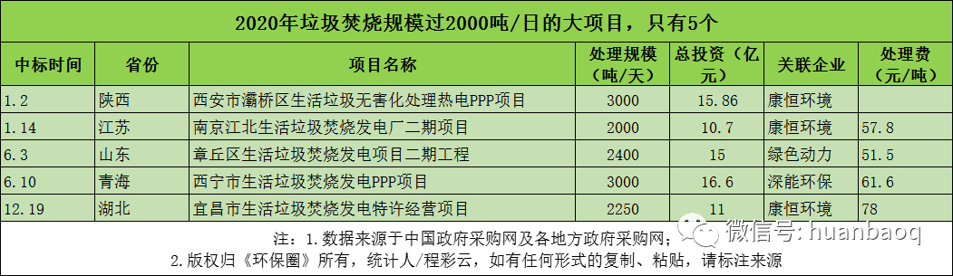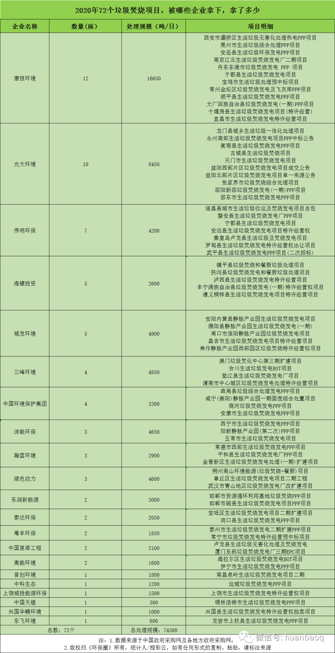 先是水務(wù)巨頭三峽集團(tuán)旗下子公司在湖北宜昌15天內(nèi)接連中標(biāo)2個(gè)垃圾焚燒發(fā)電訂單,高調(diào)“跨界”;緊接著半路出家、轉(zhuǎn)型不到3年的城發(fā)環(huán)境又要合并老牌環(huán)企啟迪環(huán)境,試圖打造黃河流域高質(zhì)量環(huán)保發(fā)展平臺(tái);然后“康恒僑銀”CP組合又從中國(guó)天楹、高能環(huán)境、偉明環(huán)保等一眾固廢名企中脫穎而出,中標(biāo)近5億元的湖北利川垃圾收集和焚燒發(fā)電一體化項(xiàng)目;最后,背靠浙江國(guó)資的浙能電力還擬以20.40元/股的價(jià)格,收購(gòu)康恒環(huán)境最高5.9%的股權(quán)。“市場(chǎng)可以公開(kāi)競(jìng)標(biāo)的項(xiàng)目一年比一年少,有些固廢名企的市場(chǎng)投資部都撤銷了,所以別再說(shuō)什么垃圾焚燒項(xiàng)目‘跑馬圈地’了,都快沒(méi)‘地’可圈了?!?/span>某固廢企業(yè)市場(chǎng)投資部經(jīng)理表示。垃圾焚燒項(xiàng)目為啥少了?日處理規(guī)模數(shù)據(jù)為啥出現(xiàn)“斷崖式下滑”?市場(chǎng)真的沒(méi)“地”可圈了嗎?接下來(lái),筆者將從項(xiàng)目分布的省份、日處理規(guī)模、總投資、中標(biāo)企業(yè)、處理費(fèi)等五大角度,通過(guò)大數(shù)據(jù)來(lái)解析一下2020國(guó)內(nèi)垃圾焚燒行業(yè)的四大特征,從而解釋之前高速增長(zhǎng)的垃圾焚燒行業(yè)為何會(huì)在2020年迎來(lái)拐點(diǎn)?是“國(guó)補(bǔ)新政”惹得禍,還是市場(chǎng)真實(shí)需求在下滑?并提出“十四五”期間國(guó)內(nèi)垃圾焚燒市場(chǎng)發(fā)展的幾點(diǎn)建議,供大家參考。01