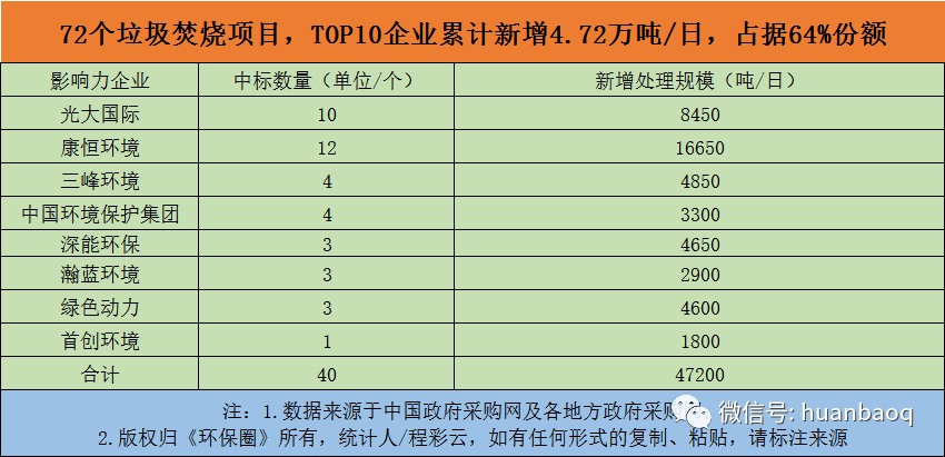 一家獨(dú)大,多強(qiáng)并進(jìn)!說(shuō)到行業(yè)集中度,先回顧一下2019年的情況。在2019年釋放的120個(gè)垃圾焚燒項(xiàng)目中,光大環(huán)境、康恒環(huán)境、中國(guó)環(huán)境保護(hù)、首創(chuàng)環(huán)境等業(yè)內(nèi)影響力企業(yè)累計(jì)中標(biāo)60座垃圾焚燒項(xiàng)目,占比全國(guó)新增項(xiàng)目的50%,日處理規(guī)模高達(dá)66550噸,約占全國(guó)新增處理規(guī)模的52%。僅光大環(huán)境一家,就“吃掉”了全國(guó)22%的份額。2019年斬獲22個(gè)項(xiàng)目新增2.87萬(wàn)噸/日規(guī)模,約占2019年全國(guó)新增處理規(guī)模的22%,在國(guó)內(nèi)垃圾焚燒版圖中,已經(jīng)實(shí)現(xiàn)了“五分天下有其一”。據(jù)筆者進(jìn)一步觀察,2020年定標(biāo)的72個(gè)垃圾焚燒項(xiàng)目,還是被業(yè)界熟知的康恒環(huán)境、光大環(huán)境、偉明環(huán)保、海螺投資、三峰環(huán)境、綠色動(dòng)力、中國(guó)環(huán)境保護(hù)等在內(nèi)22家固廢龍頭企業(yè)“瓜分”(如圖十所示)。圖十:22家固廢龍頭企業(yè)“瓜分”72個(gè)垃圾焚燒項(xiàng)目有意思的是,與2019年相比,2020年絕大多數(shù)固廢企業(yè)拿單能力減弱,比如光大環(huán)境,2019年入手了22個(gè)項(xiàng)目,新增2.87萬(wàn)噸/日的焚燒規(guī)模;而到了2020年則只斬獲了10個(gè)項(xiàng)目,新增規(guī)模不足1萬(wàn)噸/日,約8450噸/日,且集中在湖南地區(qū)。再比如城發(fā)環(huán)境,受河南垃圾焚燒市場(chǎng)的萎縮,城發(fā)環(huán)境2020中標(biāo)的垃圾焚燒項(xiàng)目減少了一半,只拿到5個(gè)項(xiàng)目,其中有4個(gè)位于河南,還有1個(gè)選址新疆昌吉市。值得一提,在其他家企業(yè)投資放緩時(shí),業(yè)界“黑馬”康恒環(huán)境則逆勢(shì)崛起,首超光大環(huán)境,2020年共獲12個(gè)垃圾焚燒訂單,新增16650噸/日處理規(guī)模,位居行業(yè)首位。繼續(xù)統(tǒng)計(jì)2020年業(yè)界十大影響力企業(yè)所占的市場(chǎng)份額,《環(huán)保圈》發(fā)現(xiàn),2020年這些企業(yè)累計(jì)斬獲40個(gè),占全國(guó)新增項(xiàng)目的57%,較2019提升了7%的增長(zhǎng)點(diǎn),累計(jì)新增規(guī)模高達(dá)4.72萬(wàn)噸/日,占全國(guó)新增規(guī)模64%,較2019提升了13%的增長(zhǎng)點(diǎn)。(如圖十一所示)圖十一:2020年TOP10影響力企業(yè)中標(biāo)數(shù)量、新增規(guī)模這再次印證,在“馬太效應(yīng)”下,垃圾焚燒領(lǐng)域“強(qiáng)者恒強(qiáng)”的局面愈發(fā)凸顯,行業(yè)集中度已由2019年的50%提升至2020的64%,“一家獨(dú)大,多強(qiáng)并進(jìn)”的局面已然形成。所以就不難理解,為何中標(biāo)的企業(yè)總是那幾家了。不過(guò)話說(shuō)回來(lái),即便這些企業(yè)拿單能力突出,跑馬圈地“圈”了許多項(xiàng)目,但并不意味著前途就一片光明,以后發(fā)展就能順風(fēng)順?biāo)恕?/span>挑戰(zhàn)其實(shí)才剛剛開(kāi)始。或許前不久光大環(huán)境總裁王天義的一番話更能說(shuō)明其中的道理。他說(shuō):受國(guó)內(nèi)市場(chǎng)日趨飽和、PPP模式政府調(diào)價(jià)、國(guó)補(bǔ)退坡、垃圾分類等因素的影響,光大環(huán)境已經(jīng)感覺(jué)到“不舒適”了。