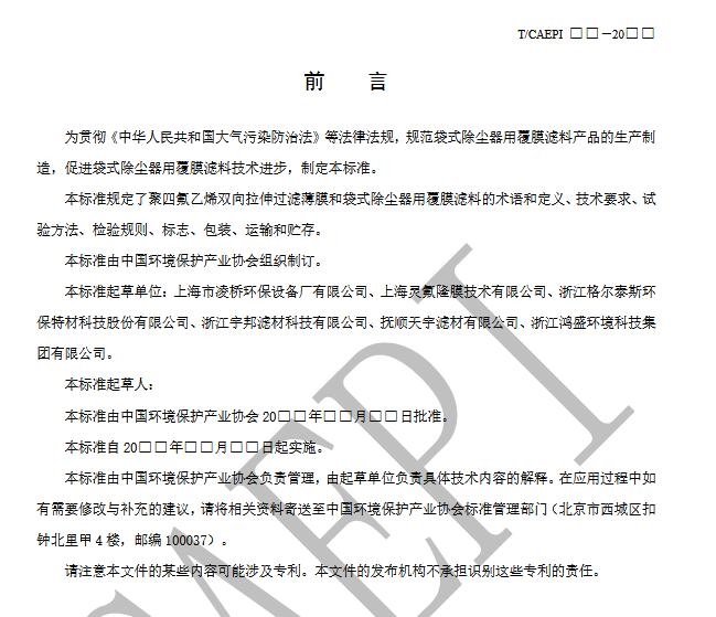 為規(guī)范袋式除塵器用覆膜濾料產(chǎn)品的生產(chǎn)制造,促進袋式除塵器用覆膜濾料技術進步,我會下達編制中國環(huán)境保護產(chǎn)業(yè)協(xié)會標準《袋式除塵器用覆膜濾料技術要求》。目前,已完成標準的征求意見稿。根據(jù)《中國環(huán)境保護產(chǎn)業(yè)協(xié)會標準管理辦法》的規(guī)定,現(xiàn)將該標準征求意見稿和有關材料印送給你們,請研究并提出書面意見,于2021年2月10日前反饋我會。