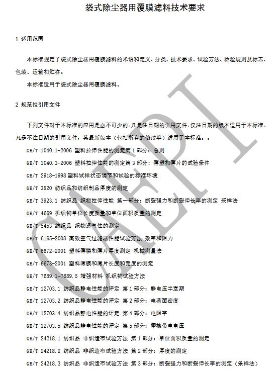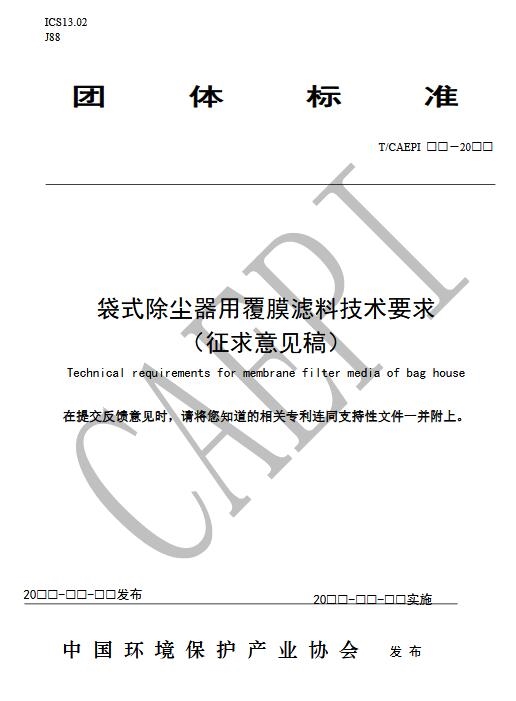 關于征求中國環(huán)境保護產(chǎn)業(yè)協(xié)會標準《袋式除塵器用覆膜濾料》意見的函