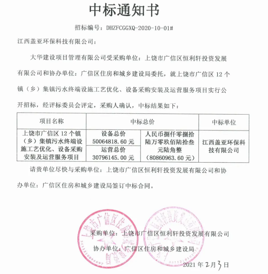 2021年1月28日,蓋亞中南成功中標(biāo)上饒市廣信區(qū)12個(gè)鎮(zhèn)(鄉(xiāng))集鎮(zhèn)污水終端設(shè)施工藝優(yōu)化、設(shè)備采購安裝及運(yùn)營服務(wù)項(xiàng)目。中標(biāo)金額達(dá)捌仟零捌拾陸萬零玖佰陸拾叁元陸角整(¥80860963.60元)。