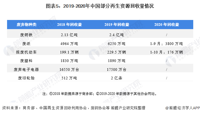 同時(shí),根據(jù)資料的公開(kāi)程度,前瞻整理了2019-2020年部分再生資源的回收情況,可以看出,與2018年相比,2019年廢棄物的回收量都有所增加,一定程度上說(shuō)明行業(yè)的回收經(jīng)營(yíng)情況較為穩(wěn)定: