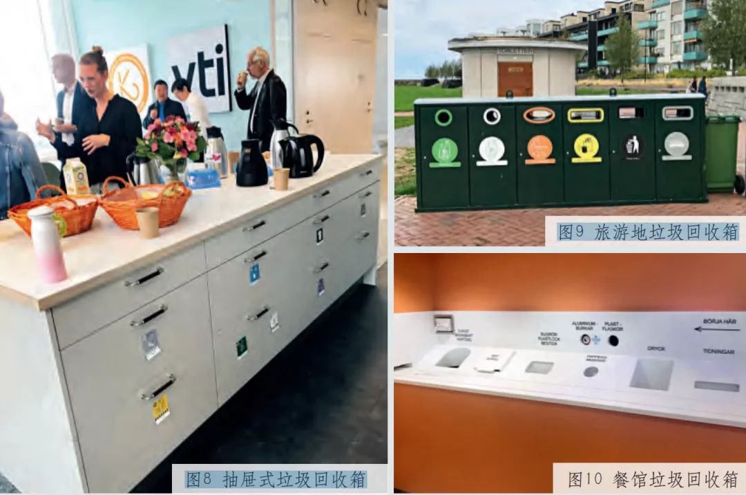 除了分類(lèi)垃圾箱外,瑞典街道上還設(shè)置了具有壓縮功能的垃圾箱,并在小區(qū)通過(guò)以上展示的部分垃圾分類(lèi)設(shè)施,反映出瑞典人對(duì)垃圾分類(lèi)嚴(yán)謹(jǐn)認(rèn)真的精神、以人為本的理念、簡(jiǎn)潔適用的設(shè)計(jì)原則。瑞典的垃圾分類(lèi)設(shè)施不完全由政府配備,單位和機(jī)構(gòu)也可自行設(shè)置,且各具特點(diǎn),已成為城市一景。