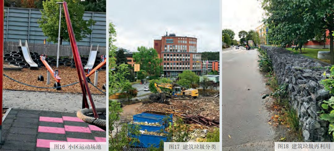 在城市的小區(qū)中還設(shè)有舊物品回收間(圖 15),市民們可以把家中不用的家具、衣物、玩具、書(shū)等舊物投放到不同的塑料桶內(nèi),由專(zhuān)業(yè)公司收取、處理和再利用。小區(qū)運(yùn)動(dòng)場(chǎng)地(圖 16) 利用舊輪胎等制作運(yùn)動(dòng)器材,做到物盡其用,減少了垃圾量。