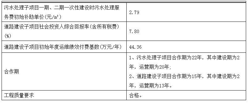 污水處理子項目合作期為22年,其中建設(shè)期為2年,運營期為20年;道路建設(shè)子項目合作期為15年,其中建設(shè)期為2年,運營期為13年。