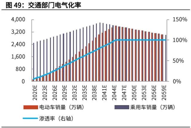 我們預(yù)計(jì),乘用車銷量在 2040 年見頂,電動(dòng)車的滲透率在 2045 年達(dá)到 100%, 則電動(dòng)車的銷量將在 2045 年達(dá)到 3600 萬(wàn)輛/年。假設(shè)單車售價(jià)保持下行趨勢(shì), 在 2060 年達(dá)到 12 萬(wàn)元/輛左右。則電動(dòng)車領(lǐng)域累計(jì)將帶來(lái) 130 萬(wàn)億人民幣的累 計(jì)新增投資。