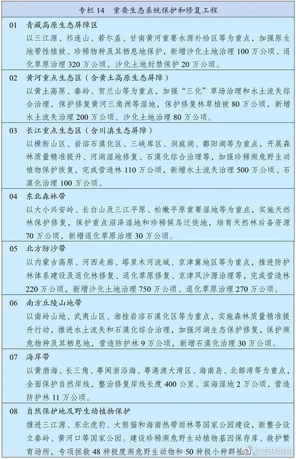 強化國土空間規(guī)劃和用途管控,劃定落實生態(tài)保護紅線、永久基本農(nóng)田、城鎮(zhèn)開發(fā)邊界以及各類海域保護線。以國家重點生態(tài)功能區(qū)、生態(tài)保護紅線、國家級自然保護地等為重點,實施重要生態(tài)系統(tǒng)保護和修復重大工程,加快推進青藏高原生態(tài)屏障區(qū)、黃河重點生態(tài)區(qū)、長江重點生態(tài)區(qū)和東北森林帶、北方防沙帶、南方丘陵山地帶、海岸帶等生態(tài)屏障建設(shè)。加強長江、黃河等大江大河和重要湖泊濕地生態(tài)保護治理,加強重要生態(tài)廊道建設(shè)和保護。全面加強天然林和濕地保護,濕地保護率提高到55%??茖W推進水土流失和荒漠化、石漠化綜合治理,開展大規(guī)模國土綠化行動,推行林長制??茖W開展人工影響天氣活動。推行草原森林河流湖泊休養(yǎng)生息,健全耕地休耕輪作制度,鞏固退耕還林還草、退田還湖還濕、退圍還灘還海成果。