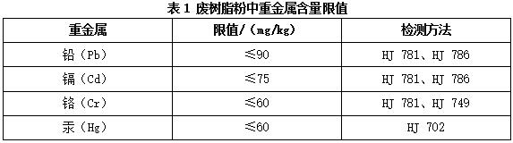 6.3.2.5企業(yè)應(yīng)對(duì)每批綜合利用的廢樹(shù)脂粉中重金屬的含量(如鉛、鎘、鉻、汞等)進(jìn)行檢測(cè),重金屬的限值與檢測(cè)方法按表1規(guī)定的執(zhí)行。利用廢樹(shù)脂粉生產(chǎn)建材的,再生產(chǎn)物除滿足國(guó)家、地方制定或行業(yè)通行的產(chǎn)品質(zhì)量標(biāo)準(zhǔn)外,其中有害物質(zhì)含量及浸出限值應(yīng)執(zhí)行HJ1091和GB 30760的要求。