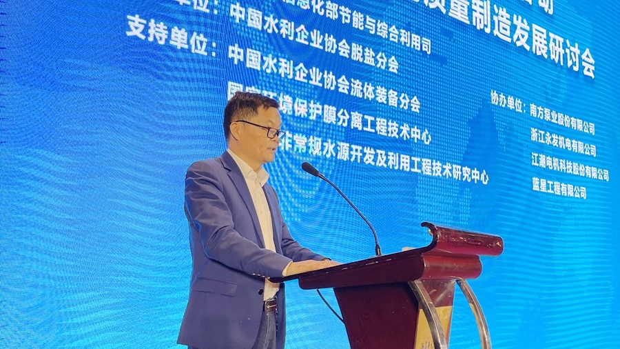 中國水利企業(yè)協(xié)會脫鹽分會會長郭有智,延安市寶塔區(qū)委常委、區(qū)政府常務副區(qū)長劉宇梁,中國水利企業(yè)協(xié)會流體裝備分會會長牟介剛,脫鹽分會副會長—南方泵業(yè)總裁沈鳳祥、杭州水處理技術(shù)研究開發(fā)中心總工程師楊波、自然資源部天津海水淡化與綜合利用研究所張旖、超純環(huán)??偨?jīng)理王軍、東晟環(huán)保副總經(jīng)理汪大慶,脫鹽分會秘書長—天元恒業(yè)水總經(jīng)理李明,會議協(xié)辦單位—南方泵業(yè)總經(jīng)理沈勤偉、浙江永發(fā)機電董事長高樹彪、江潮電機副總裁陳建躍、藍星工程總工吉春紅等領(lǐng)導嘉賓應邀出席了本次會議。