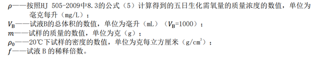 試樣中五日生化需氧量(BOD5)以質量濃度ρ2計,單位以毫克每升(mg/L)表示,按式(2)計算: