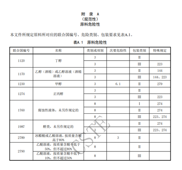 本文件所規(guī)定原料所對應的聯(lián)合國編號、危險類別、包裝要求見表A.1。