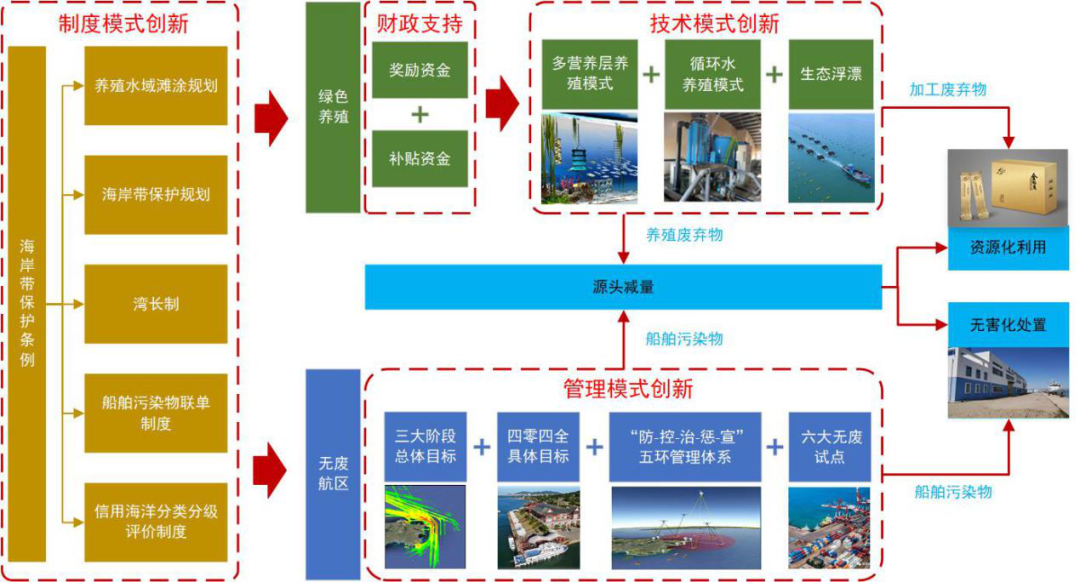 近年來,威海市立足“海洋強(qiáng)市”戰(zhàn)略,積極謀劃海洋綠色發(fā)展大局,不斷強(qiáng)化海陸、區(qū)域、政策三個(gè)統(tǒng)籌,著力解決養(yǎng)殖加工廢棄物和船舶污染物污染防治問題,探索形成了“海洋廢棄物”陸海統(tǒng)籌綜合管控模式。圖 3 威海市“海洋廢棄物”陸海統(tǒng)籌綜合管控模式示意圖
