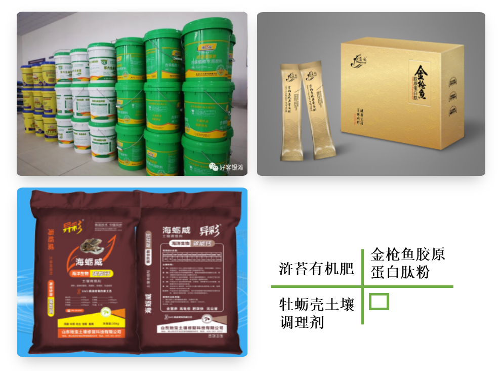 針對(duì)滸苔污染,支持溫喜生物科技有限公司,通過研發(fā)生物發(fā)酵技術(shù),構(gòu)建滸苔綜合利用產(chǎn)業(yè)鏈,生產(chǎn)有機(jī)肥、土壤調(diào)理劑,可年處理鮮滸苔10余萬噸,實(shí)現(xiàn)產(chǎn)值3500余萬元。針對(duì)廢棄牡蠣殼,依托山東地寶土壤修復(fù)科技有限公司,利用高溫增氧活化等技術(shù),可日生產(chǎn)300噸功能性土壤調(diào)理劑,年銷售產(chǎn)品5萬余噸。針對(duì)金槍魚加工后剩余的魚骨、魚皮等,推動(dòng)藍(lán)潤(rùn)集團(tuán)研發(fā)酶組合技術(shù),開發(fā)生產(chǎn)金槍魚膠原蛋白肽粉、口服液、面膜等系列產(chǎn)品,附加值翻了數(shù)十倍,真正實(shí)現(xiàn)將一條金槍魚“吃干榨凈”。圖 14 威海市“海洋廢棄物”資源化利用產(chǎn)品2. 制度模式創(chuàng)新