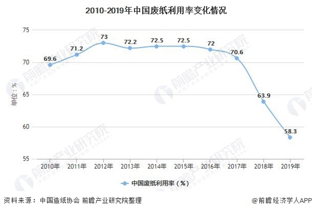 近年來(lái)廢紙一直是支撐我國(guó)造紙工業(yè)發(fā)展的重要纖維原料,隨著我國(guó)造紙?jiān)辖Y(jié)構(gòu)的不斷調(diào)整,雖然廢紙漿使用率在2014年以后逐年下降。2011-2017年,我國(guó)廢紙利用率均高于70%,到2019年,我國(guó)廢紙利用率已跌至58.3%。