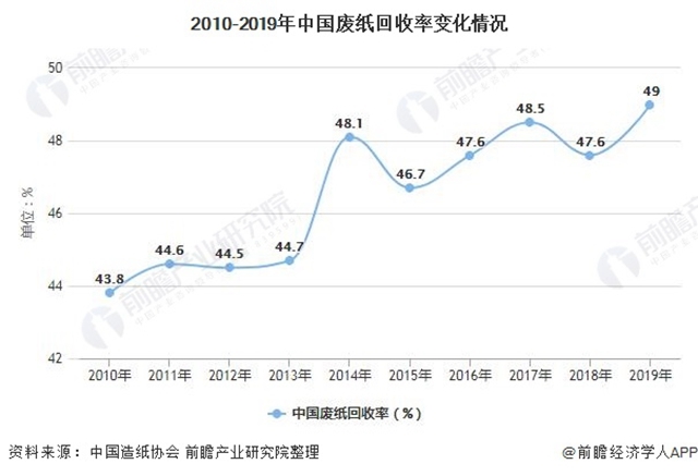但近年來(lái),隨著國(guó)民環(huán)保意識(shí)的調(diào)高和垃圾分類的推廣,我國(guó)廢紙回收率波動(dòng)上升,2019年,我國(guó)廢紙回收率達(dá)到49.0%,實(shí)現(xiàn)10年間廢紙回收率的新高。