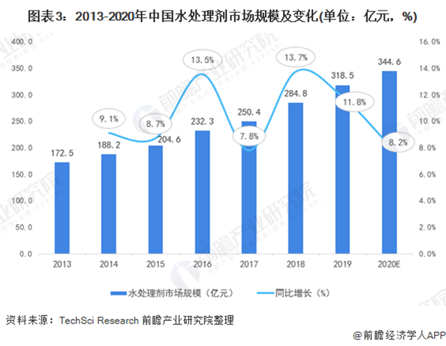 我國(guó)的水處理藥劑市場(chǎng)處于快速增長(zhǎng)的階段,根據(jù)TechSci Research數(shù)據(jù)顯示,2019年我國(guó)水處理劑市場(chǎng)規(guī)模達(dá)318.5億元,預(yù)計(jì)2020年我國(guó)市場(chǎng)規(guī)模增長(zhǎng)率約為8.2%,達(dá)到344.6億元。
