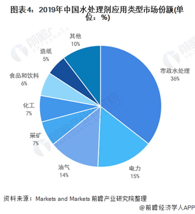 根據(jù)Markets and Markets的數(shù)據(jù),2019年我國(guó)市政水處理、電力、油氣、采礦、化工、食品和飲料、造紙、其他領(lǐng)域水處理藥劑市場(chǎng)占比中,用于市政水處理的水處理劑市場(chǎng)規(guī)模最大,約為36%,為水處理劑最大的應(yīng)用市場(chǎng);其次是電力領(lǐng)域和油氣領(lǐng)域,分別占比15%和14%。