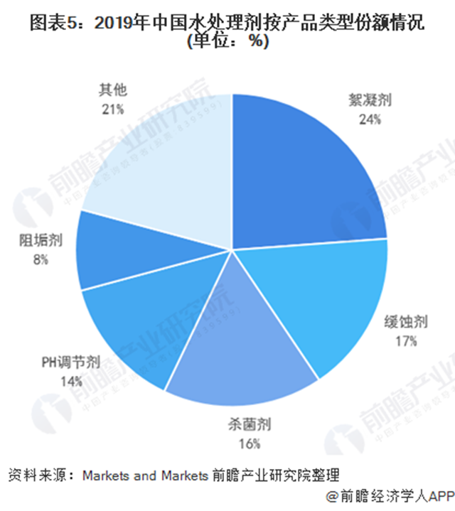 從水處理劑種類來(lái)看,絮凝劑、緩蝕劑和殺菌劑是市場(chǎng)規(guī)模較大的水處理劑種類,2019年我國(guó)水處理劑品種劃分的市場(chǎng)結(jié)構(gòu)中,絮凝劑的市場(chǎng)份額占比為24%、緩蝕劑的市場(chǎng)份額占比為17%;殺菌劑的市場(chǎng)份額占比為16%、pH調(diào)節(jié)劑的市場(chǎng)份額占比為14%、阻垢劑的市場(chǎng)份額占比為8%,前五名產(chǎn)品市場(chǎng)占比近80%。