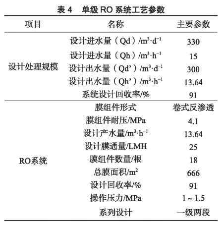 單級(jí)RO主要是針對(duì)兩級(jí)DTRO系統(tǒng)出水氨氮值超過限值而采取的保安措施,單級(jí)RO系統(tǒng)的主要工藝參數(shù),見表4。