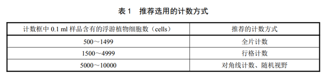 根據(jù) 8.3.1 調整后的浮游植物的密度,選用合適的計數(shù)方式,使測定過程中浮游植物細胞的總計數(shù)量為 500 個——1500 個。表1為推薦選用的計數(shù)方式。