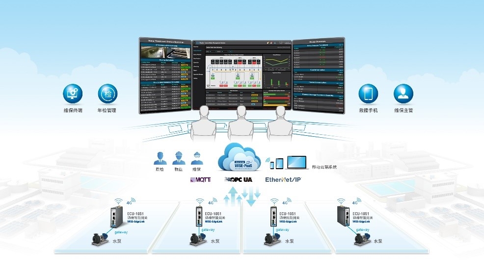 當前很多的泵站監(jiān)控仍以人工方式進行現場啟停,誤操作/延遲操作等情況時有發(fā)生,導致監(jiān)測不精準,監(jiān)管不到位,事故頻發(fā)。研華ECU-1051系列智能網關支持多種型號的PLC控制器的數據采集,并可以通過MQTT協(xié)議直接對接運營商所選的云平臺Webaccess為BS架構組態(tài)軟件,有效采集、展示、分析數據。通過遠程控制方式對于現場設備進行實時、準確的監(jiān)測及故障預警,遠程分級監(jiān)控管理設備狀況,實現設備、人、數據、流程的互聯(lián)互通,無縫對接企業(yè)ERP/CRM/手機APP系統(tǒng)遠程資產管理設備位置信息建立產品知識庫,優(yōu)化產品性能及供應鏈管理,提高產品競爭力。