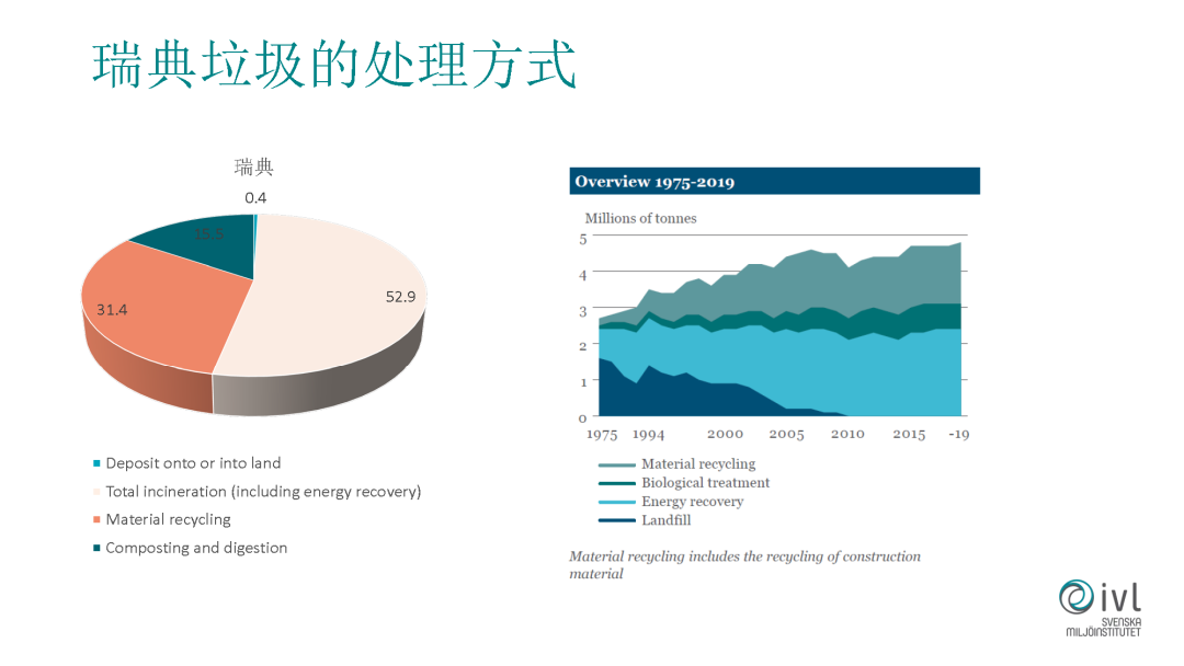 其他的垃圾處理的手段,比如做垃圾電能源,我們所說的垃圾焚燒,我們國內現(xiàn)在做的也非常好了。有一點不太一樣,在瑞典它的垃圾焚燒不只是發(fā)電,更多的是去供熱。瑞典的垃圾焚燒廠很多建在市中心,逛完街可能對面就是垃圾焚燒廠。為什么能建的這么近?一個是考慮它供熱比較方便,不用長距離輸送熱量。另外垃圾焚燒的排放做到了非常讓民眾幸福的水平,在過去也有大家不喜歡垃圾焚燒廠在自己家附近,現(xiàn)在所有的居民完全接受這個實施了。