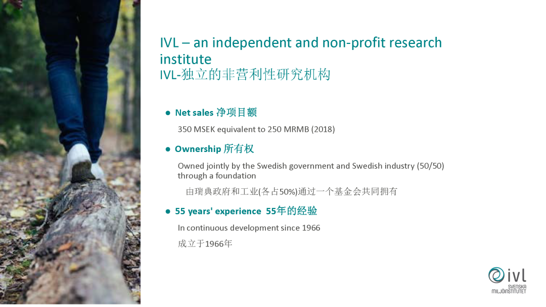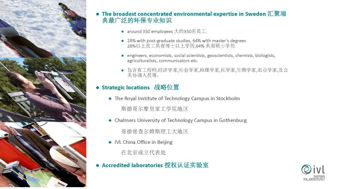 先簡單介紹一下我們的機構,我們的機構是由瑞典的政府和工業(yè)各占50%成立的一個非盈利性的應用性的研究機構,成立于1966年,到目前有五十多年的歷史。我們的總部是在瑞典的首都斯德哥爾摩,在其他的國家,在中國和印度都有代表處,目前我們有350名的員工。包括環(huán)境工程師、經(jīng)濟學家、社會學家等等各方面一些跨學科的專家,在瑞典我們有自己的實驗室,除了科研以外也做一些技術開發(fā)、技術轉移等工作。