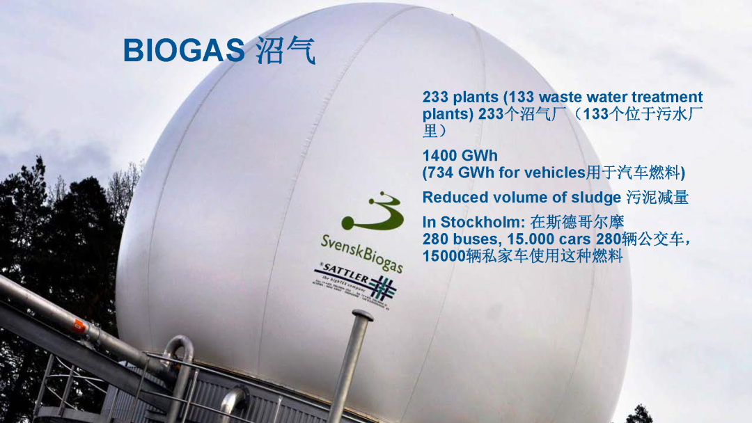 其他的一些技術手段,很重要的,也是一直在推廣的,就是沼氣。瑞典國家不大,只有一千萬人口,但是它的沼氣工廠還是相對比較多的。這個不是最新的數(shù)據(jù),最新的有250、260個,其中一半以上位于污水處理廠,為什么是這樣呢?因為市政污水處理每天會產(chǎn)生很固定的很多的污泥,污泥在瑞典全部是用來生產(chǎn)沼氣的。不像中國,中國目前很多的污泥都很難處理。